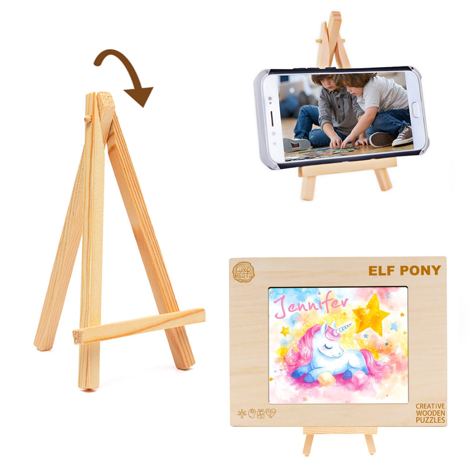 Wooden easel display stand featuring a custom children's puzzle with a unicorn illustration.