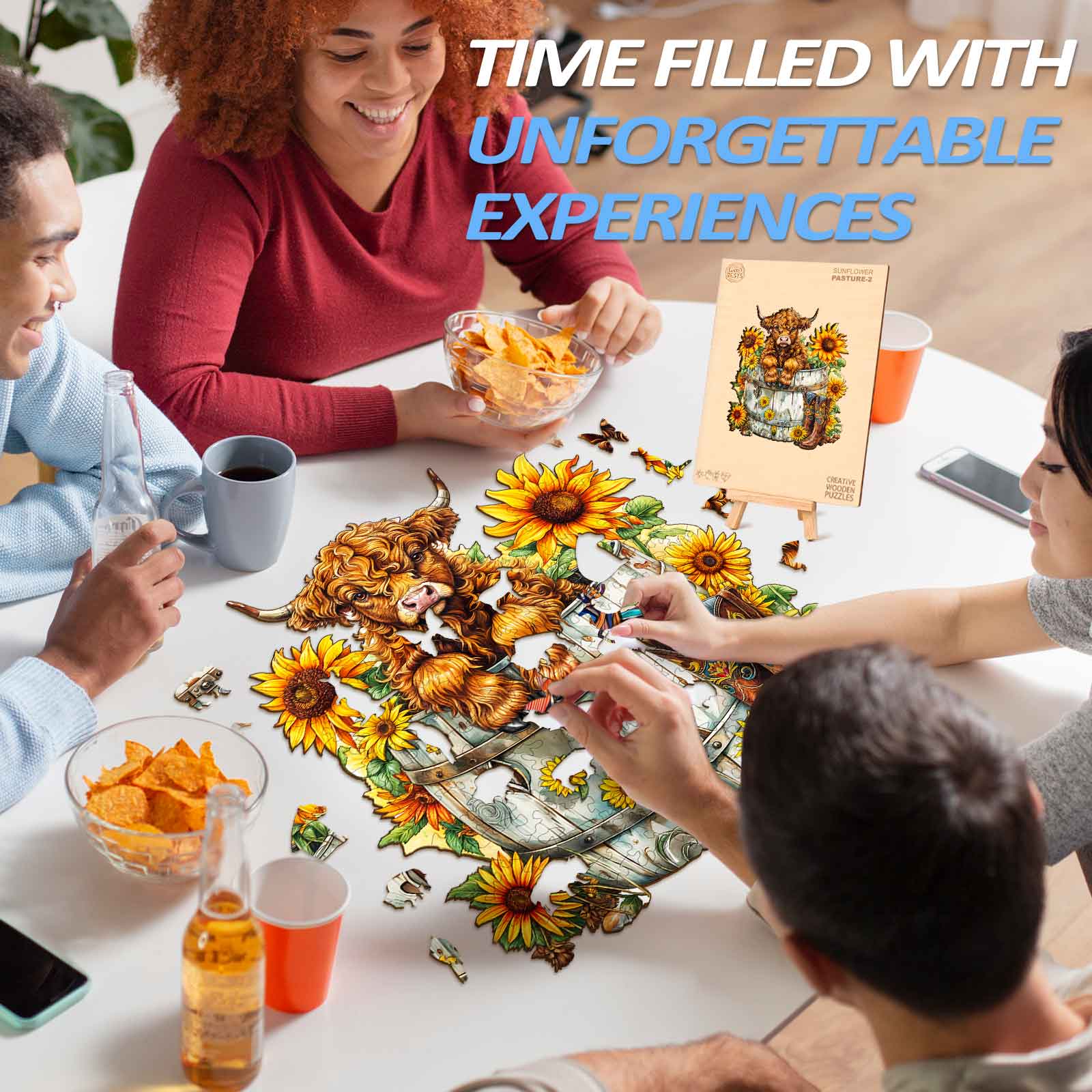 Group of friends enjoying the Sunflower Pasture-2 wooden jigsaw puzzle together, fostering connection and fun.